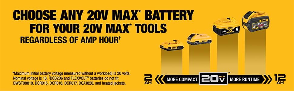 *Note: “20V MAX” refers to the maximum initial battery voltage (measured without a workload), which is 20 volts. Nominal voltage is 18 volts.